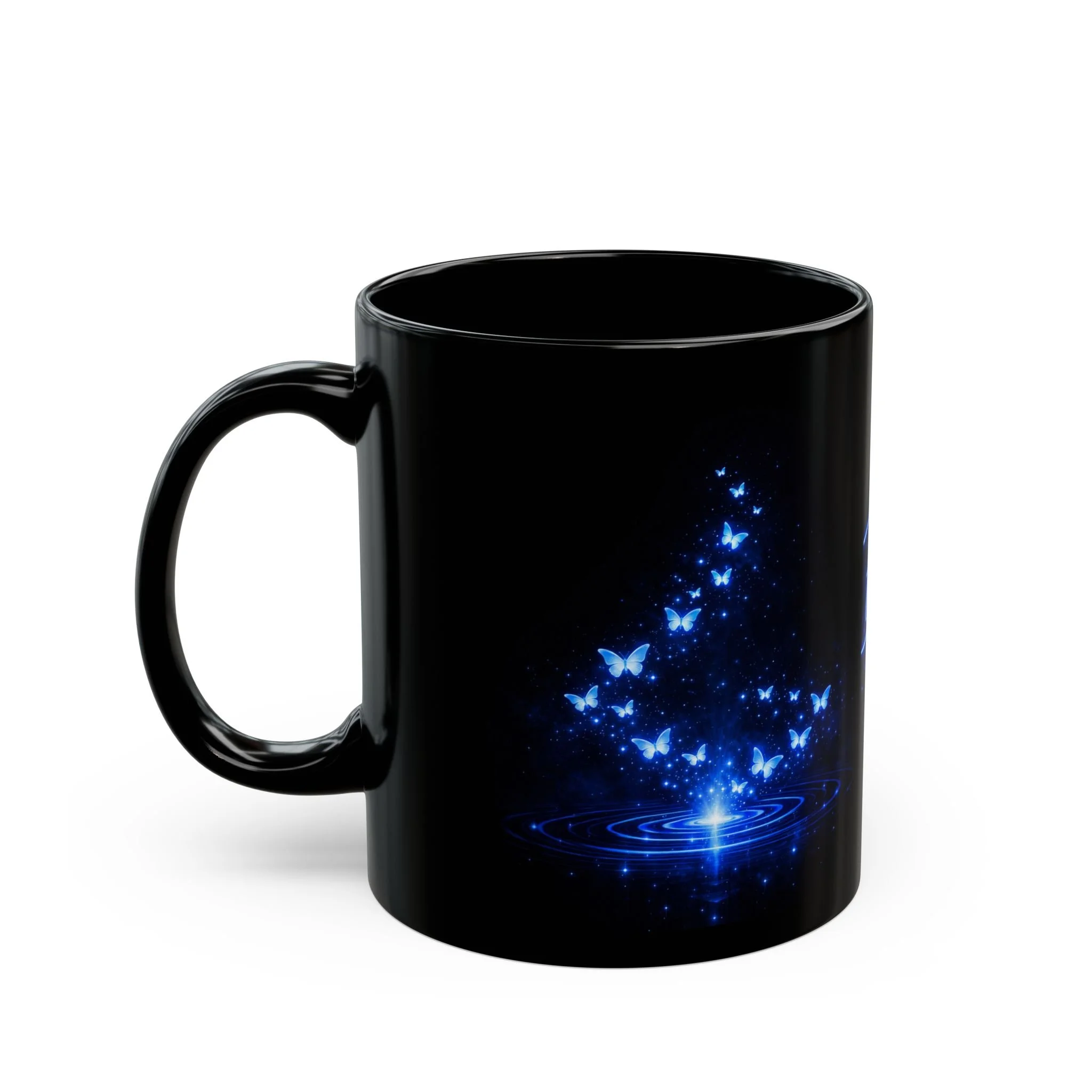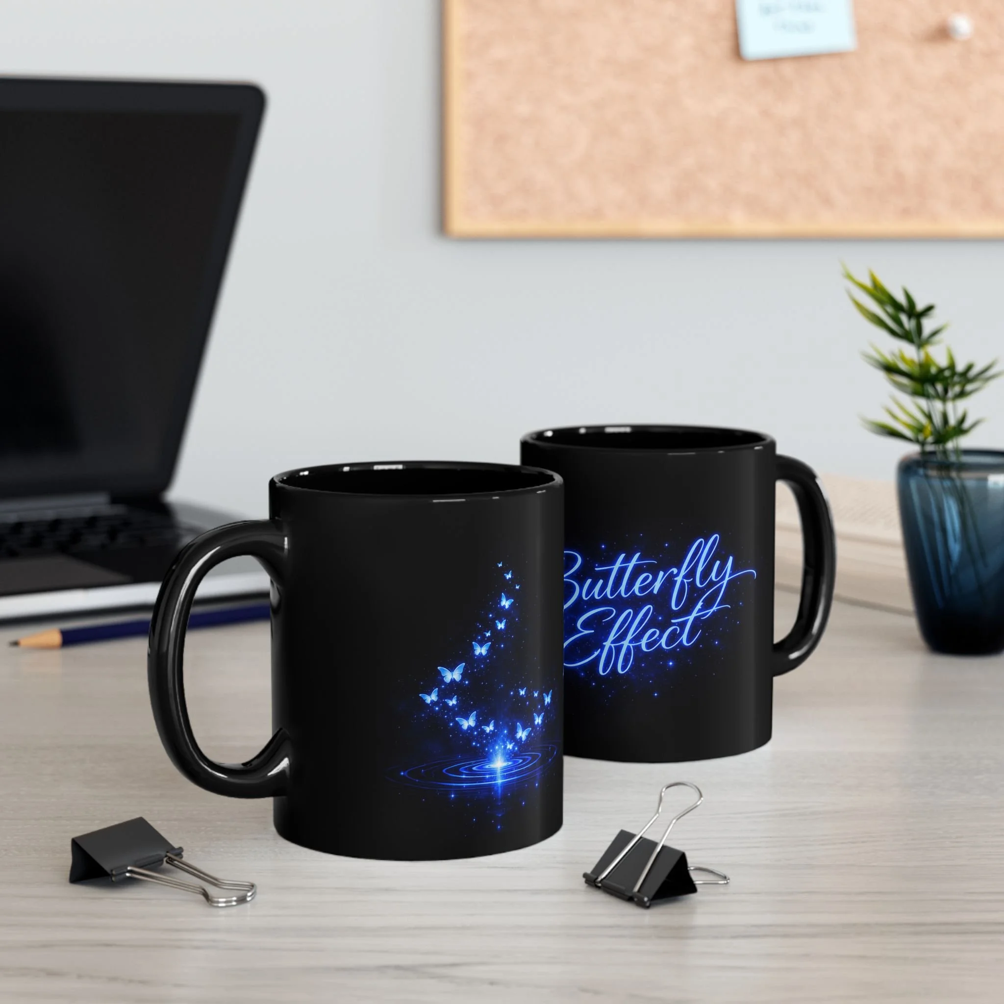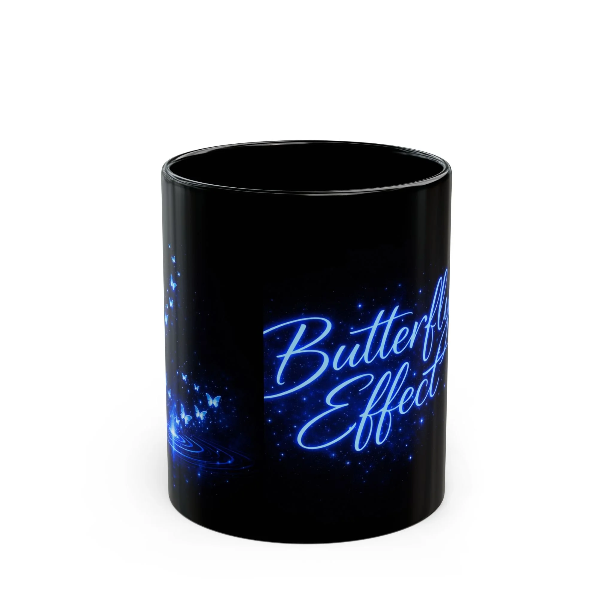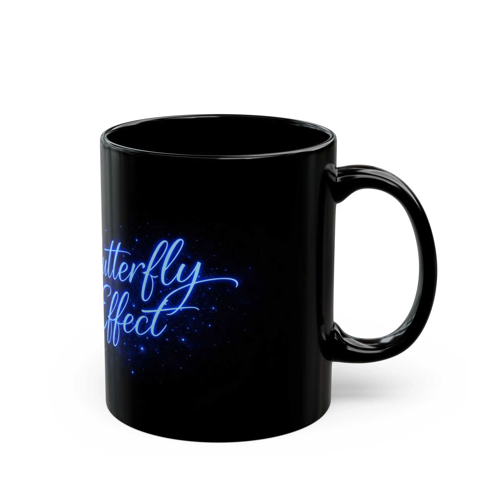 Butterfly Effect Black Mug — Neon Blue Script Coffee Cup (11oz & 15oz)