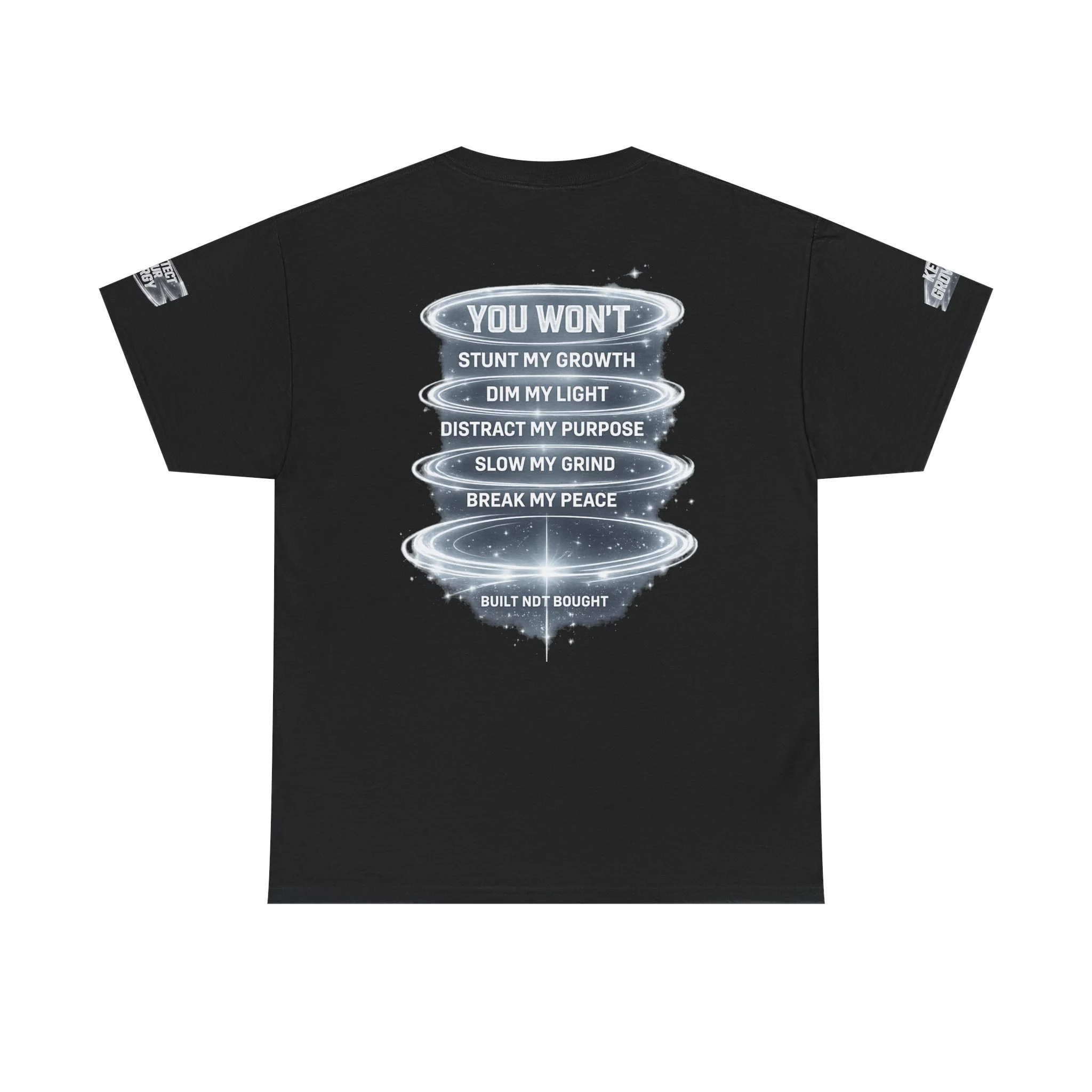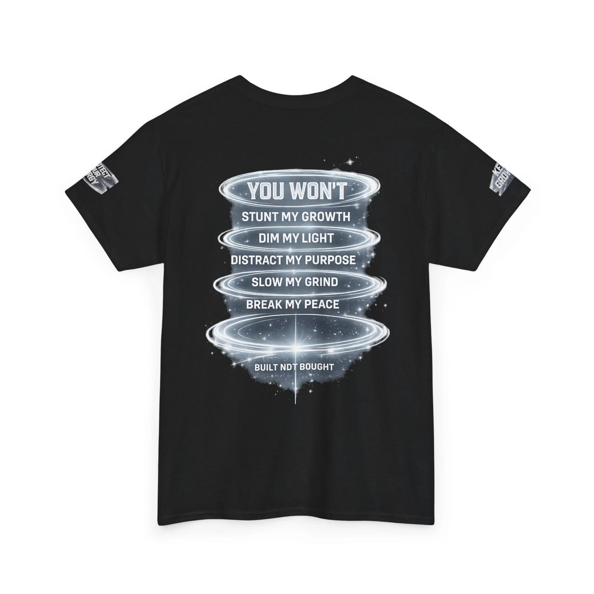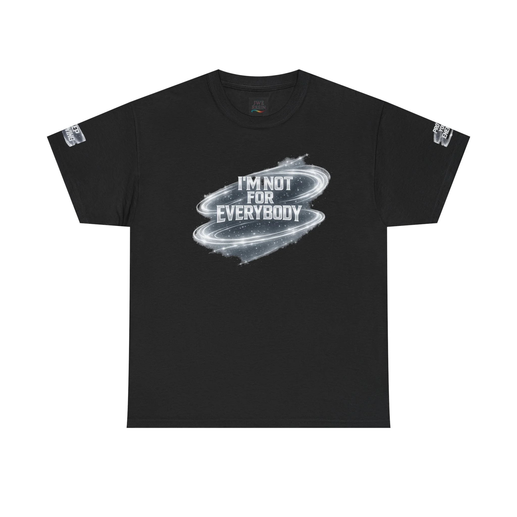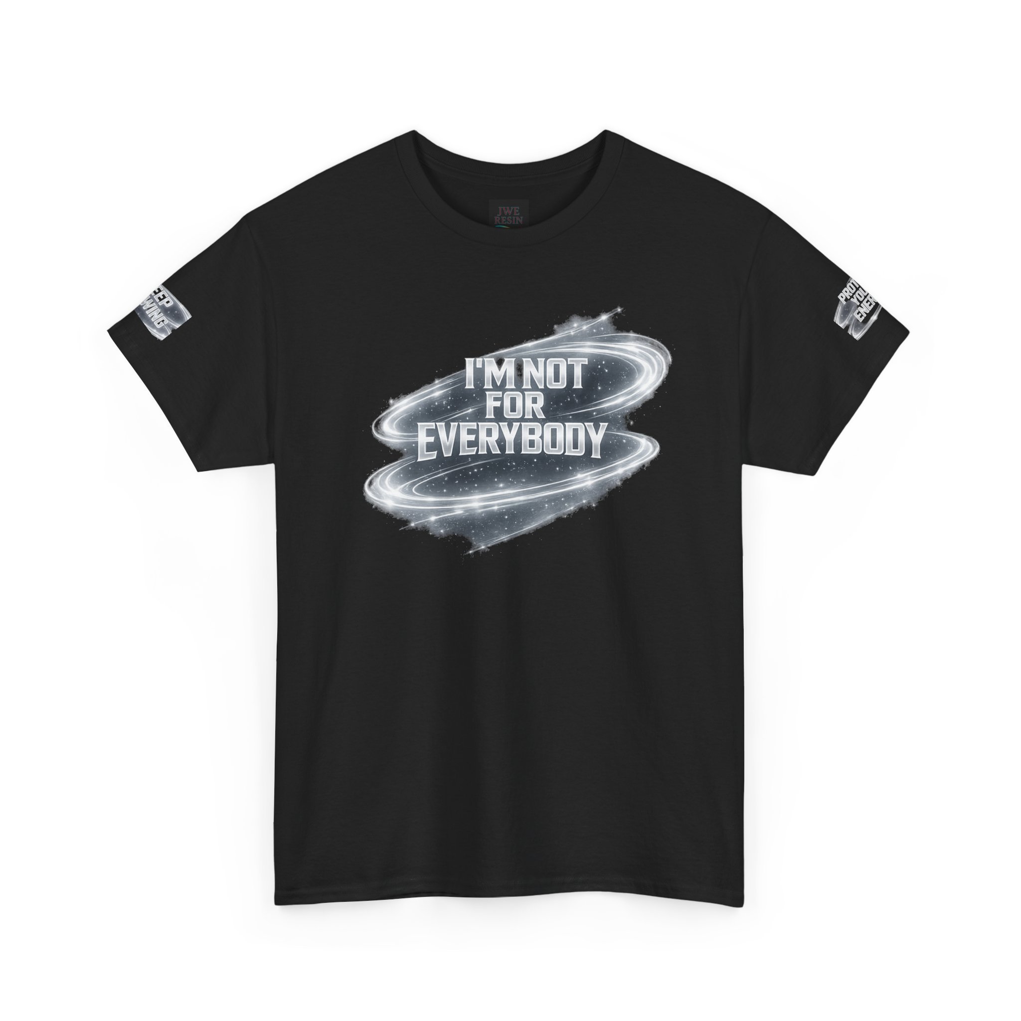 This classic cotton tee carries bold energy — a midnight-black canvas with electric blue, sci-fi inspired lettering declaring confidence: "I'M NOT FOR EVERYBODY" across the chest and a stacked manifesto on the back listing what won’t be allowed to hold you back. The graphic feels cinematic and defiant, like a personal anthem you can wear to amplify boundaries and celebrate steady growth. It sits comfortably through long days thanks to a relaxed, classic fit and soft, durable fabric. Wear it on nights out, during studio sessions, or while pushing through a creative grind — it reads like a quiet roar that says you choose your own path.