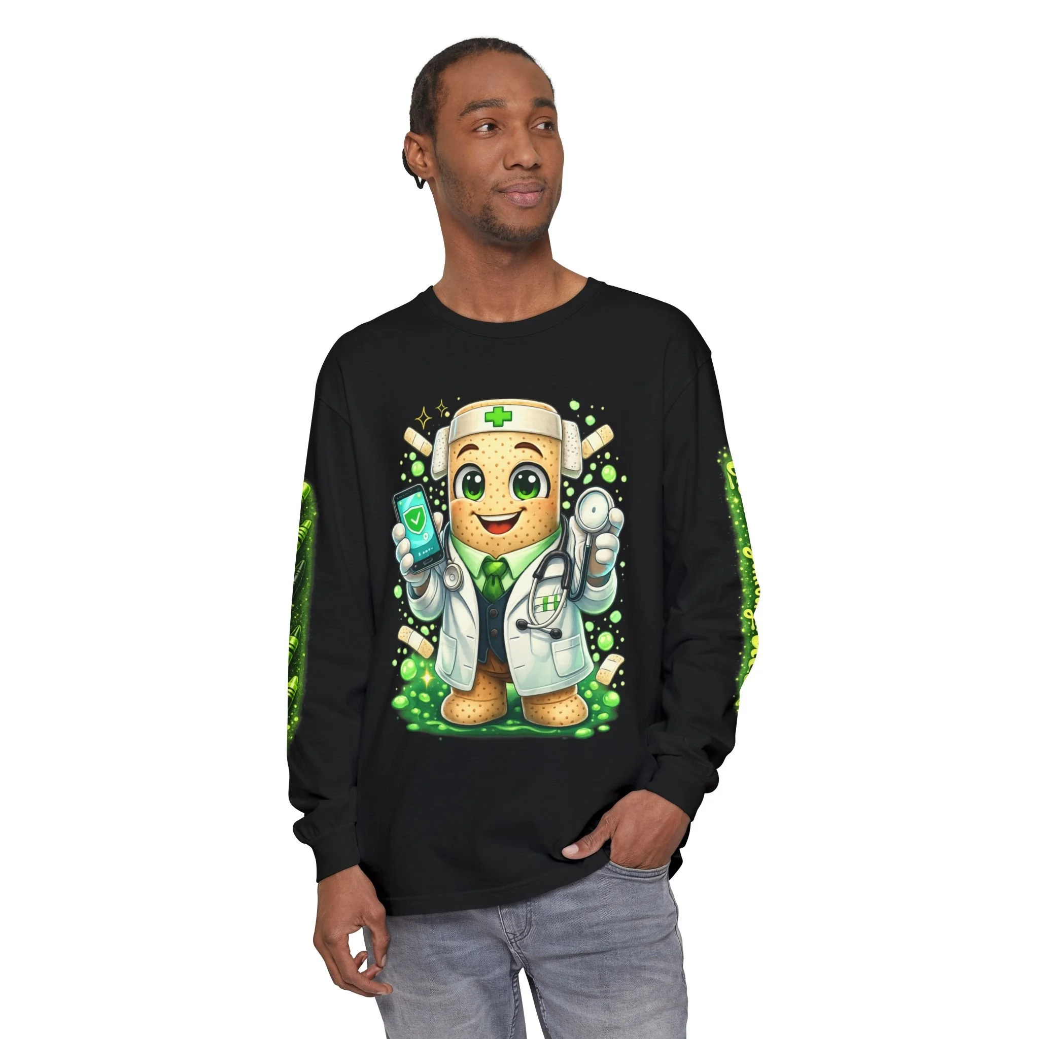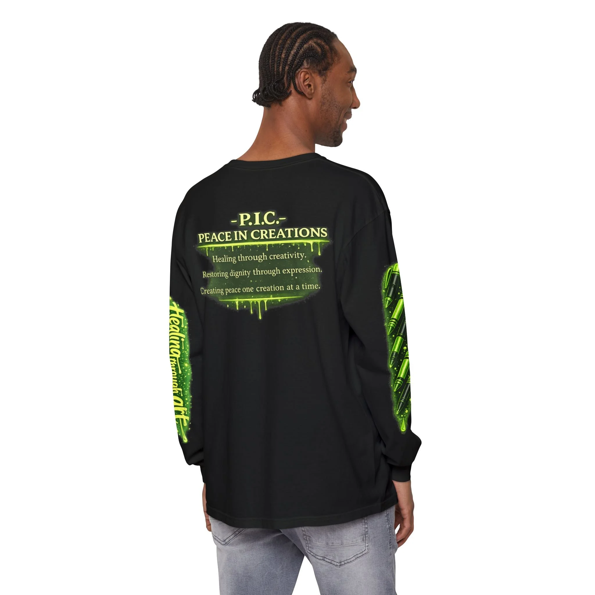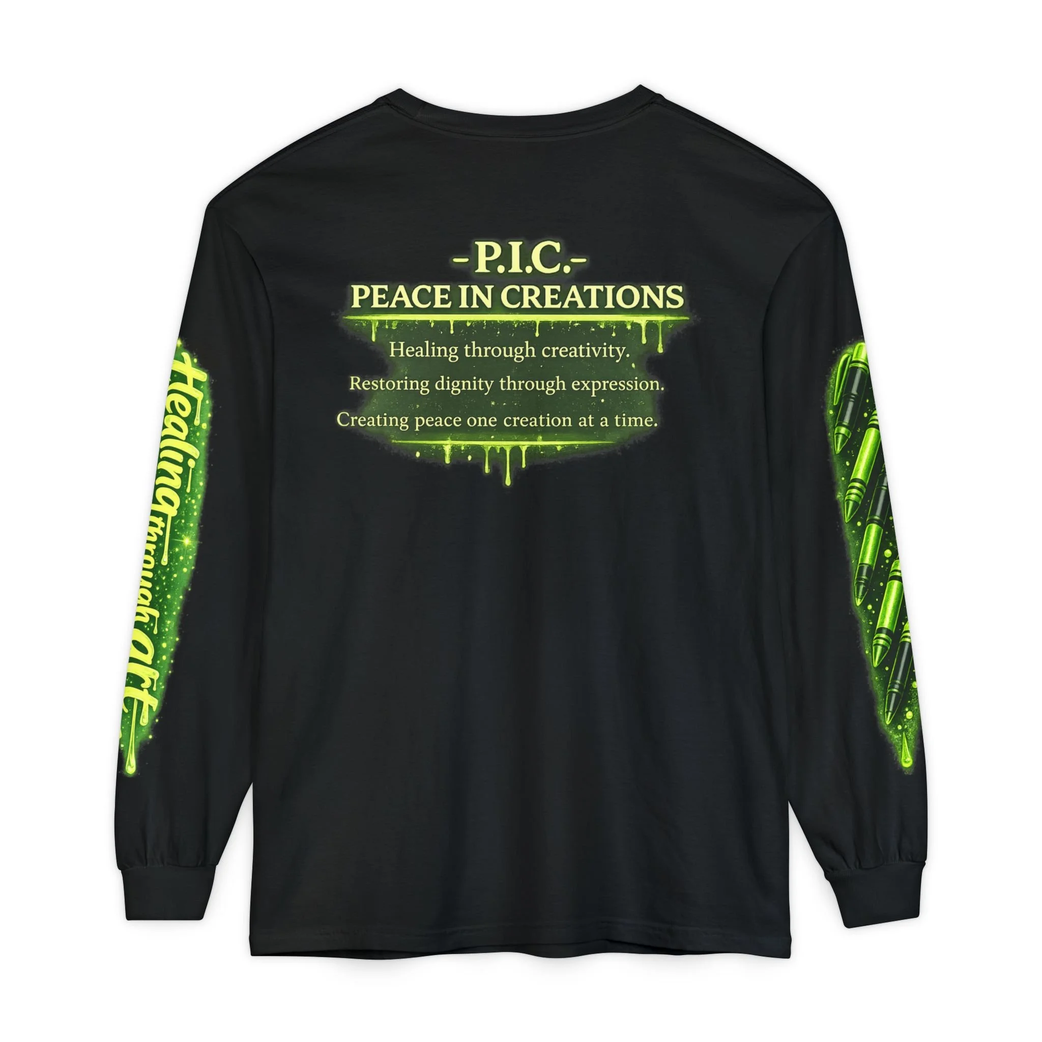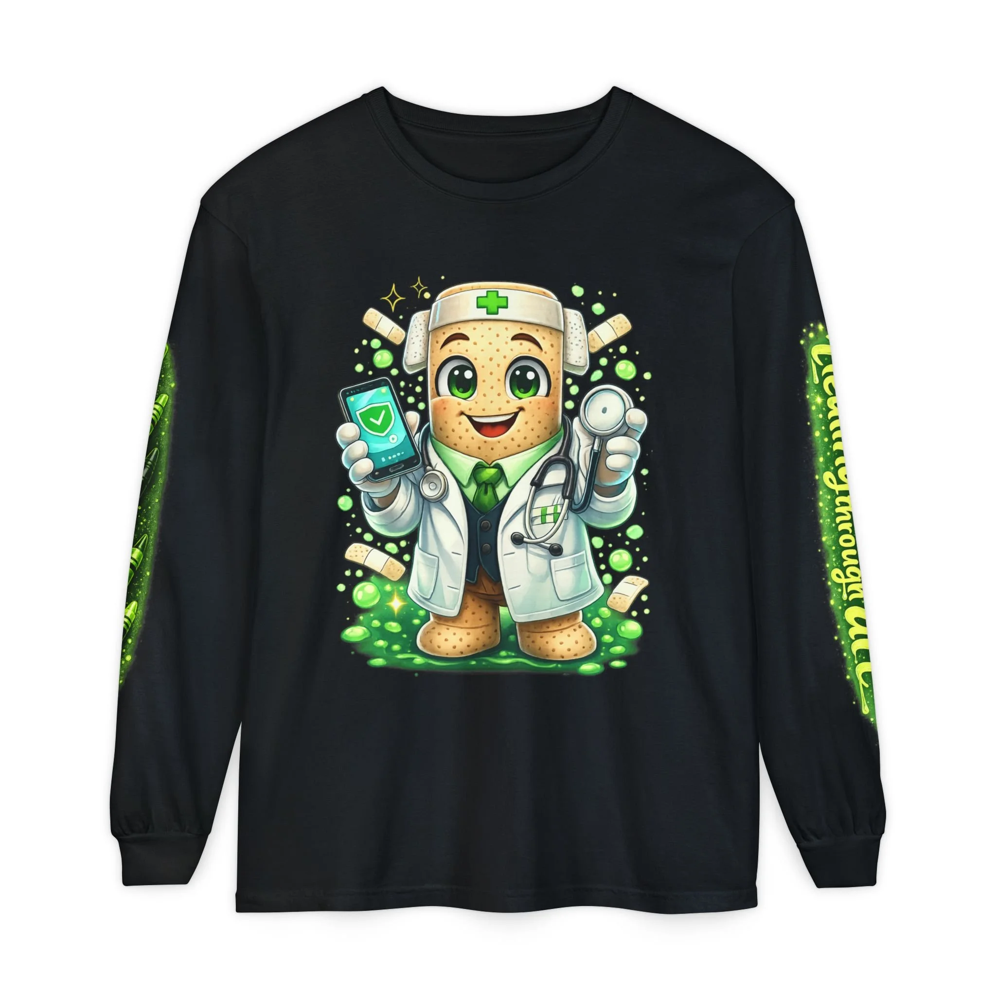 Soft, garment-dyed long sleeve with a playful, healer-themed design that feels like a warm creative hug. The front features a cheerful, bandaged mascot in a white coat holding a stethoscope and phone—tiny hearts and bandages scatter around, giving the shirt a caring, whimsical energy. The sleeves carry coordinating green script and pattern accents, while the back displays a mottled green badge reading “P.I.C. — Peace In Creations” with a short mission line beneath. The medium-weight cotton drapes comfortably, the ribbed cuffs and double-stitched hems hold their shape, and the garment-dyed finish gives a lived-in softness and muted color that grows cozier with wear. This long sleeve sits naturally in the wardrobe of someone who blends creativity and compassion—wear it during community events, studio days, volunteer shifts, or quiet moments when you want to remind yourself and others that healing can be playful and purposeful.